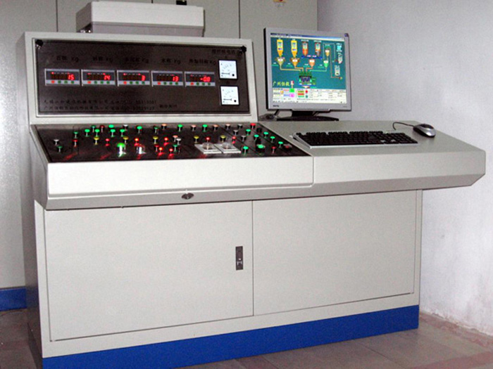 雙機(jī)90攪拌站電氣控制系統(tǒng)主要由控制臺(tái)以及交流接觸器等為核心的強(qiáng)電控制組成,全套系統(tǒng)均安裝在控制室內(nèi),可完成配料、提升、攪拌、卸料生產(chǎn)全過(guò)程的自動(dòng)、半自動(dòng)控制。